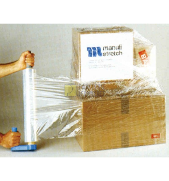 Film transparent haute résistance étirable "Eurostretch", pour palettisation. Dimensions: 300 x 450 mm. Epaisseur 17µ.