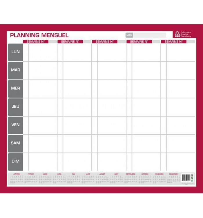 PEFC : Le papier utilisé pour ce planning est certifié PEFC, garantissant une gestion durable des forêts. - Imprim’Vert : L'impression respecte la norme Imprim’Vert, réduisant ainsi l'impact environnemental de la production. Optez pour le planning mural perpétuel de Bouchut Grandrémy pour une gestion efficace de vos plannings mensuels, un engagement en faveur de l'environnement et une qualité de fabrication française irréprochable.