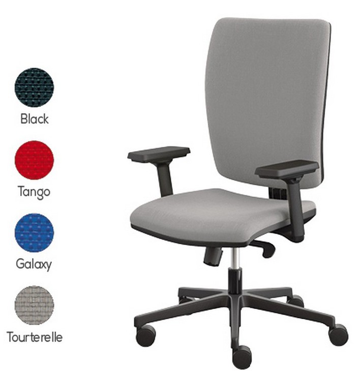Siège de travail aux dimensions généreuses. Mécanisme synchrone, à blocage multipositions avec système anti-retour du dossier, réglable en intensité. Dossier réglable en hauteur par crémaillère. Réglage de la hauteur d'assise par vérin à gaz. Accoudoirs 3D réglables en hauteur, largeur, profondeur.